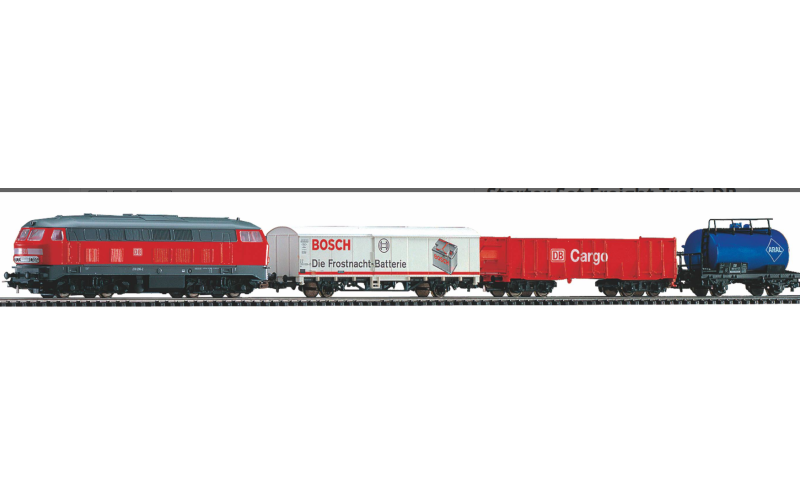 Start" set with a DB Cargo freight train consisting of a class 218 diesel locomotive, a boxcar, a four-axle high side car, and a two-axle tank car.